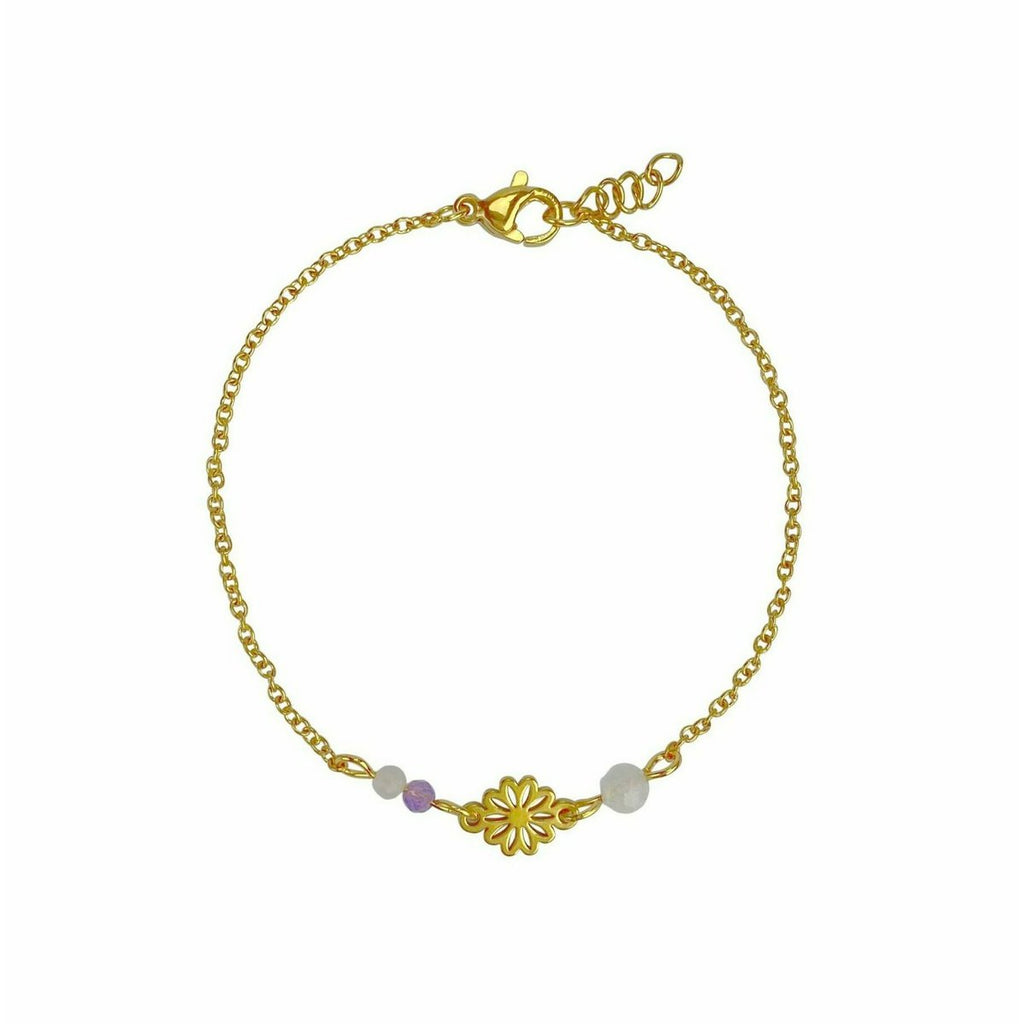 Stainless steel armbandje met naast elkaar Rozenkwarts en Amethist, een stainless steel bloemetje en dan een Maansteentje. Alle edelsteentjes zijn facet geslepen en hebben een prachtige schittering.