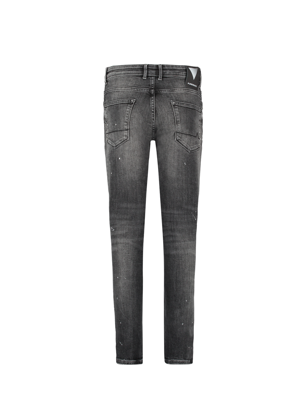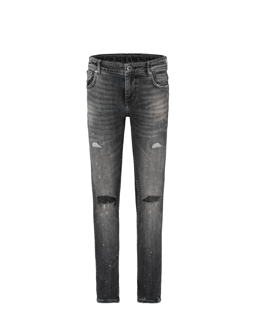 Jongensjeans van Ballin met five-pockets en verstelbaar elastiek in de tailleband. Met repaired damage en witte verfspatten. Skinny fit model.