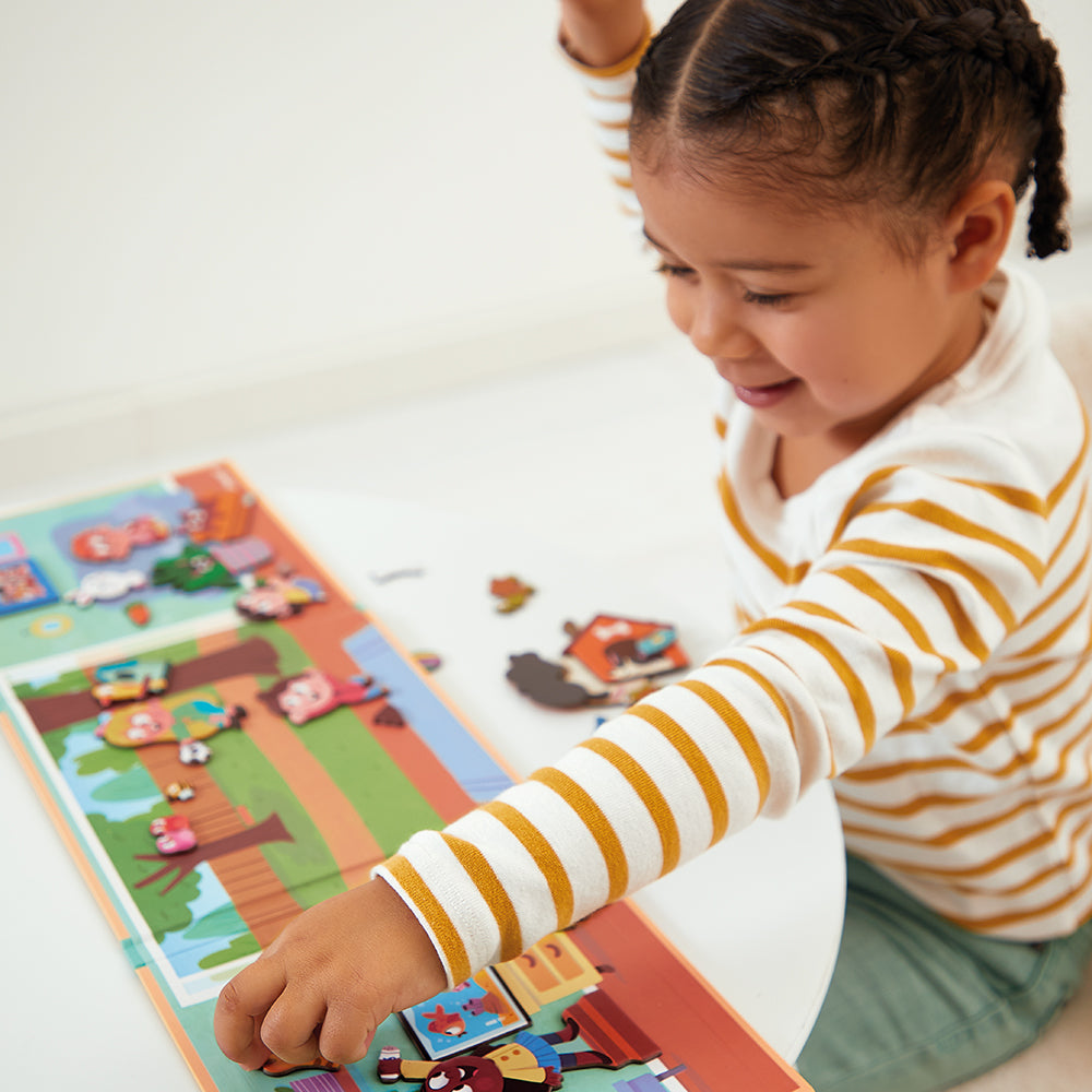 Welkom in dit grote huis, gevuld met dieren waarvoor je moet zorgen en die alleen maar willen spelen! Je moet spelen met de bal met de hond, de vissen voeren en de hamster niet uit het zicht verliezen die er dol op is om zich in schoenen te verstoppen! Met het groot magnetisch decor en de 30 magneten geeft uw kind alles wat nodig is om de grootste verhalen te verzinnen. Magnetisch speelgoed van FSCTM-karton.
