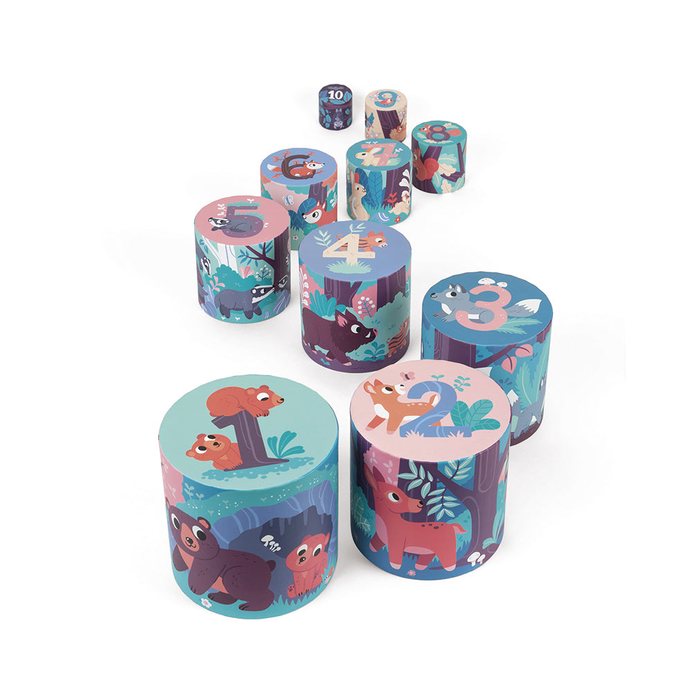 Kartonnen stapeltoren met 10 te stapelen elementen om een schitterende piramide te bouwen in het thema van de dieren uit het bos. Op de bovenkant van elk element bevindt zich een cijfer. Met deze piramide leert uw kind tot 10 tellen en ontwikkelt hij zijn motoriek en verbeeldingskracht op een leuke manier!