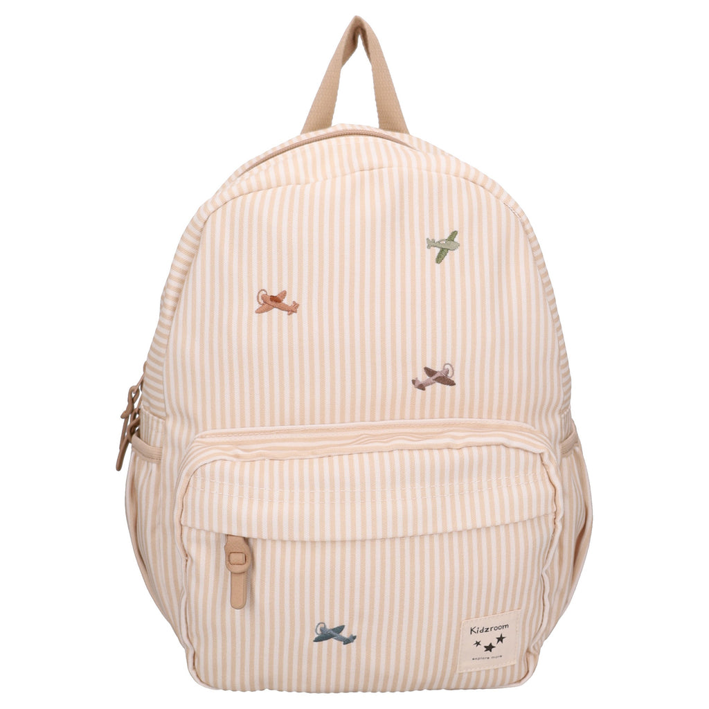 Deze leuke beige rugzak uit de Nostalgia-collectie is perfect voor elk avontuur en een echte must-have voor je kindje. De tas is gemaakt van gerecycled polyester en vrolijk versierd met een all-over strepenprint met vliegtuigjes. Het ruime hoofdvak met dubbele rits biedt voldoende ruimte voor een broodtrommel, drinkfles, een extra setje kleding en beschikt over een praktisch voorvak met rits voor kleine spulletjes. Ideaal voor naar school of een dagje uit! De rugzak kan gedragen worden aan de stevige lus aan de bovenzijde of comfortabel op de rug met de verstelbare schouderbanden. Dankzij de handige gespen op de schouderbanden blijft de tas altijd stevig en prettig zitten. Binnenin is de rugzak voorzien van een naamlabel en een houder voor een drinkfles, zodat alles netjes op zijn plek blijft. Een vrolijke en praktische rugzak waar je kindje veel plezier van zal hebben!