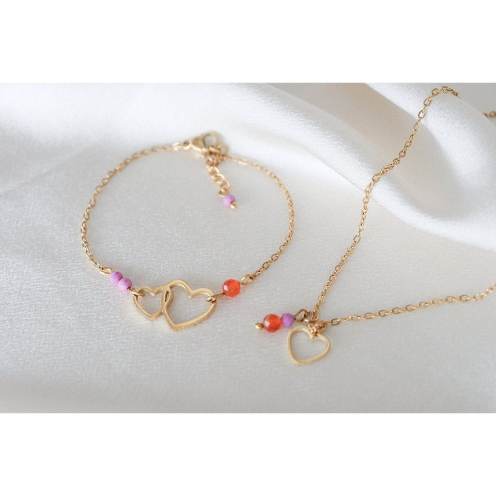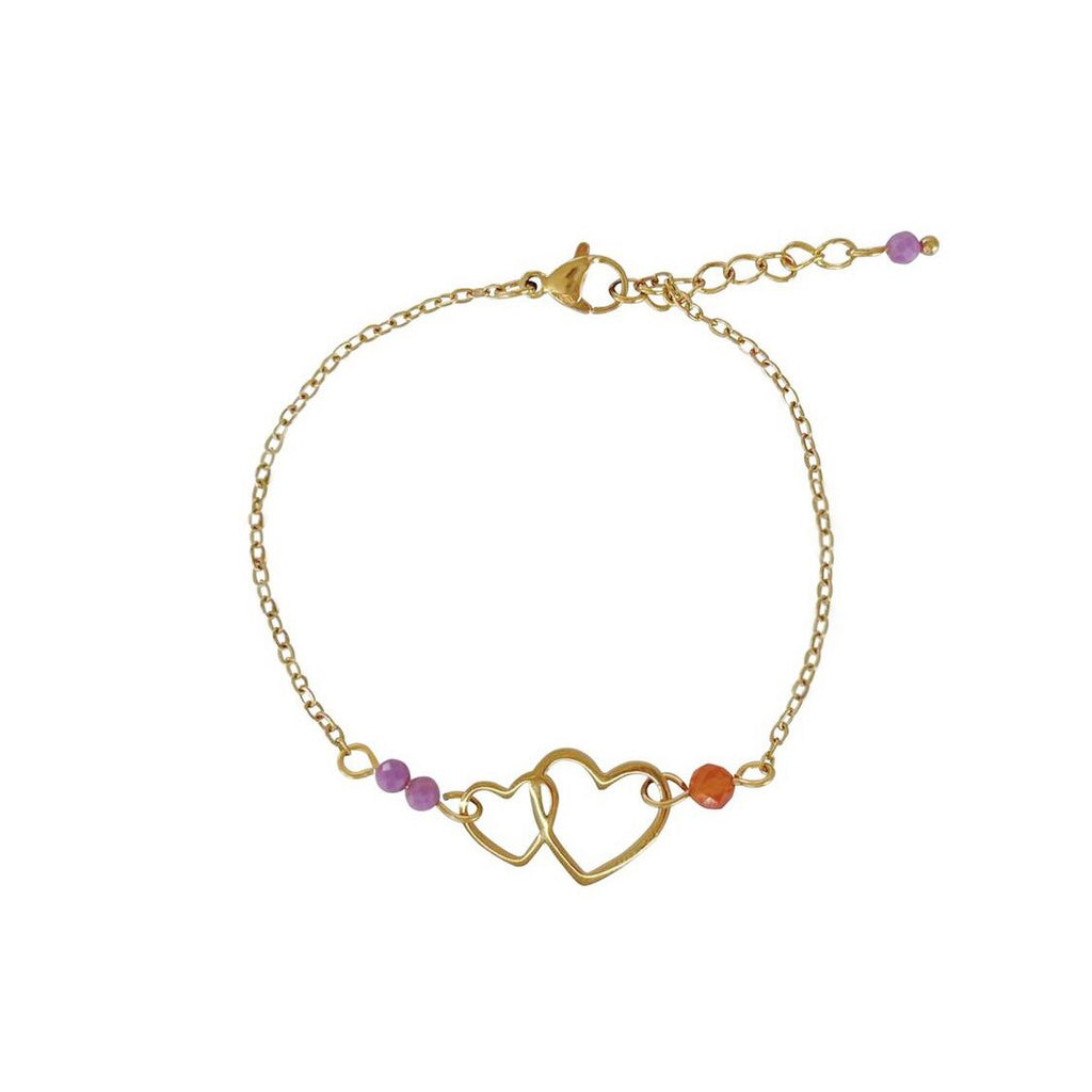 Liefdevol & Moedig Armbandje, gemaakt van stainless steel. Aan het armbandje vind je twee Lepidoliet steentjes en een Carneool steentje. Ook vind je aan het verlengkettinkje een Lepidoliet steentje. Alle steentjes zijn facet geslepen en schitteren mooi. De hartjes zijn hoog gepolijst en hebben een mooie glans, hierdoor hebben ze een luxe uitstraling. Het handgemaakte armbandje is hypoallergeen, sterk, duurzaam en kleurvast. Wij maken alle sieraden in ons eigen atelier.